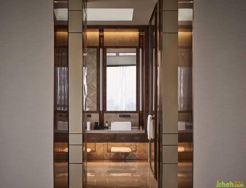 主衛(wèi)墻面大面積以幾何拼花彰顯出序列結(jié)構(gòu)之美,在燈光效果的渲染下,可謂色澤交錯(cuò),塑造出三維立體的視覺張力。頂端設(shè)一天窗引入光線,更是活躍了空間意境。