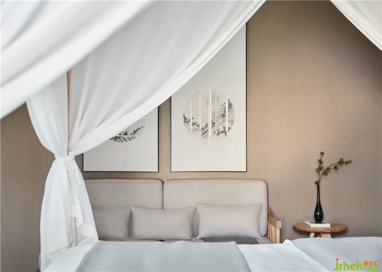 白色紗幔隨風(fēng)飄然而起,隨畫作與插花對(duì)話古今,在看似無意間氤氳著從容自如的淡雅之韻。枕水而息,坐擁太湖風(fēng)光又將人文意境帶入其中,返璞歸真的境地莫過如此。