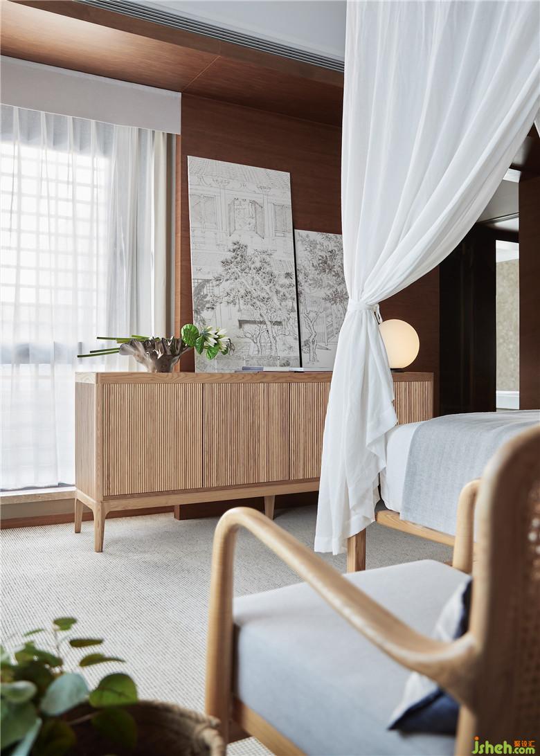二樓主臥充分利用采光,參照酒店式起居場景,“人”字型屋頂配上架子床,空間感更強(qiáng),也進(jìn)一步映射出東方氣息以及度假風(fēng)情。