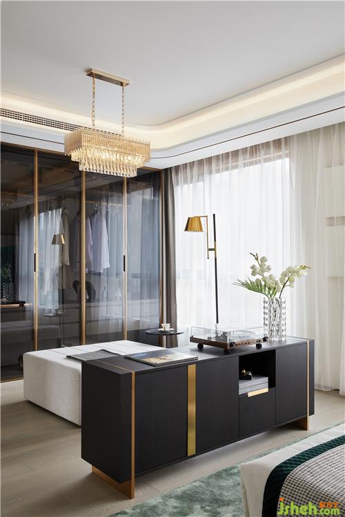 在陽(yáng)光映射下,沿用金屬與玻璃材質(zhì)的衣帽間,釋放出干練型格與微妙張力。既凸顯其本身的光澤與韻味,又保證了與套間的溫暖聯(lián)結(jié)。