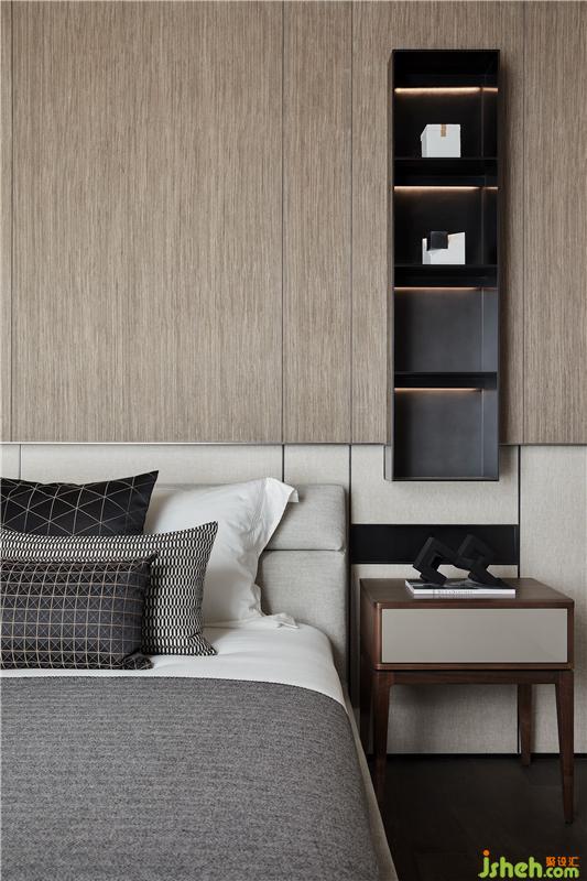 二樓的主臥套間進(jìn)一步精研空間的穿透與情趣。設(shè)計(jì)師從山巒的層疊中捕獲靈感,在大塊面的延伸、穿插與碰撞之間,構(gòu)成錯(cuò)落的關(guān)系。左右滑動(dòng)式的木格柵柜門設(shè)置,滲透出別樣的自在與柔和。