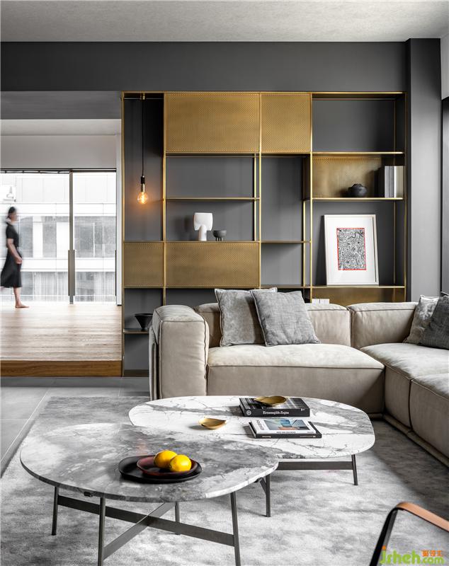 客廳受結(jié)構(gòu)的限制及業(yè)主的要求,進(jìn)行了適度的比例縮放。大面落地窗加強室內(nèi)外的聯(lián)動,南浦大橋美景盡收眼底。軟裝陳設(shè)在素凈的基調(diào)下盡顯隨性自由氣息,力求還原生活本真。L型沙發(fā)極盡柔軟,而定制的黃銅格架,借由沖孔板的穿梭點綴,在不拘一格的形態(tài)關(guān)系中有效拉升層次,可謂恰到好處的調(diào)和。