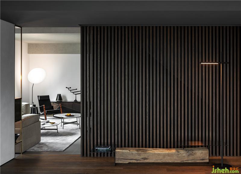 玄關(guān)背景墻基于原始建筑的承重柱體串聯(lián)組建,凹凸有序、粗獷質(zhì)樸的肌理感迎面襲來,安寧靜謐的居家氛圍不期而至。由此形成的兩條動線模式,為通往客廳、活動區(qū)與餐廳帶來更多趣味感。