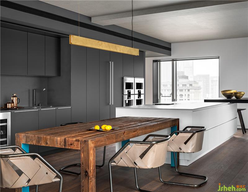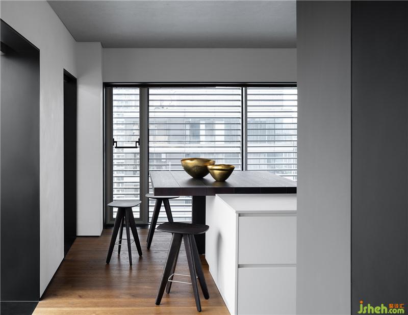 餐桌與島臺一體順延,呈疊級狀起伏,與西廚區(qū)的開放互聯(lián)也遵循著豪宅應(yīng)有的比例尺度。三面落地窗讓這里擁攬絕佳的視野與采光,透過形態(tài)、材料、色澤與細(xì)節(jié),越發(fā)詮釋出大都會的俊朗風(fēng)度。這是裝修設(shè)計團(tuán)隊對一貫的克制平衡之道的踐行,蘊藏著對簡約美學(xué)的嚴(yán)謹(jǐn)思考,也無一不透露出對品質(zhì)感的嚴(yán)苛追求。