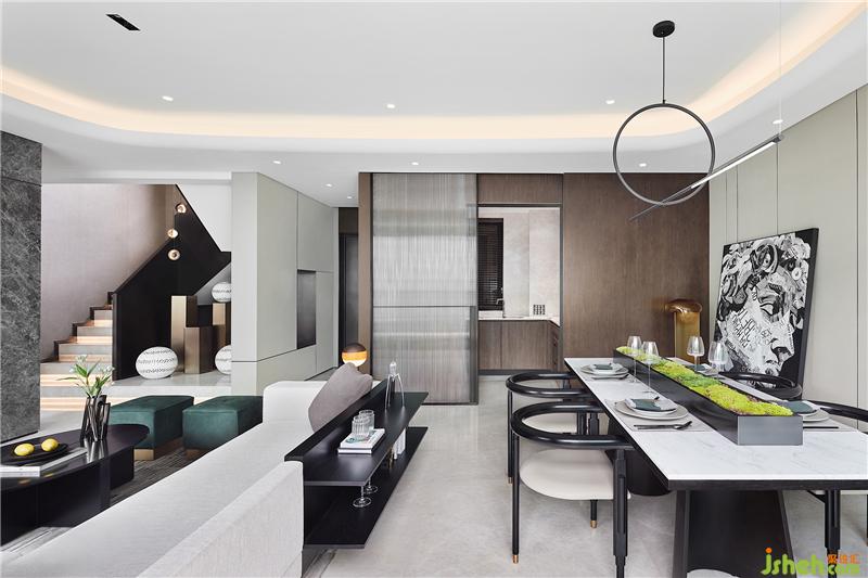 廚房以木盒子體塊打造而成,玻璃移門在開合之間,保證區(qū)隔的同時又呈現(xiàn)出多種材料的碰撞之美,給人以無限遐想。復(fù)式裝修設(shè)計