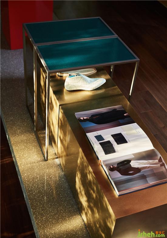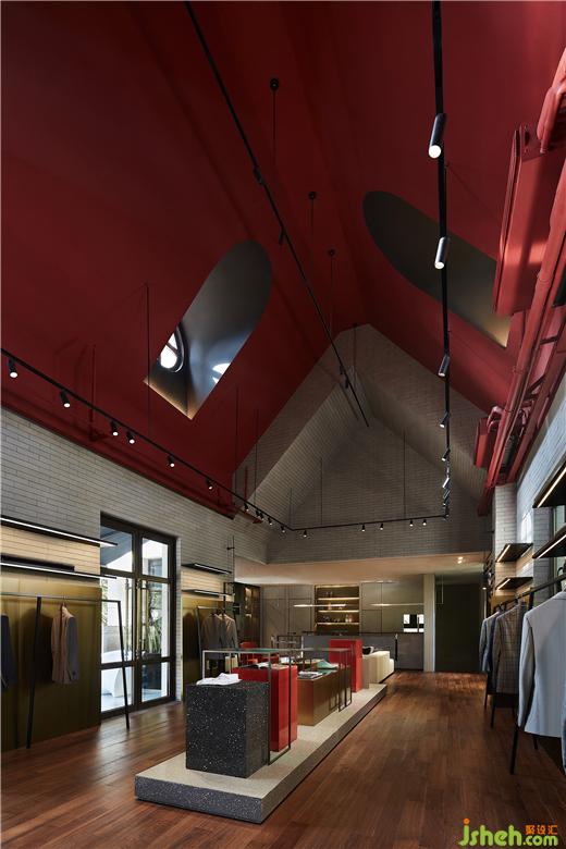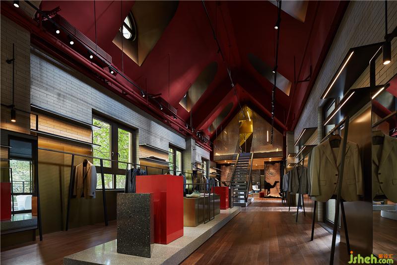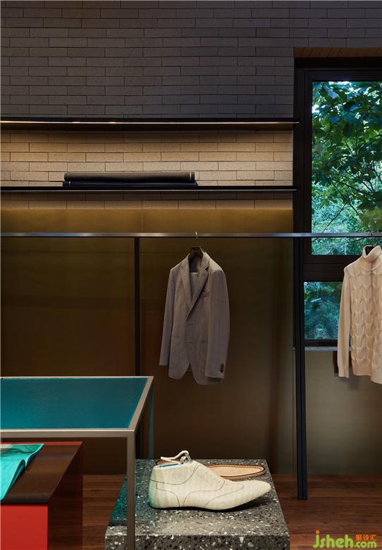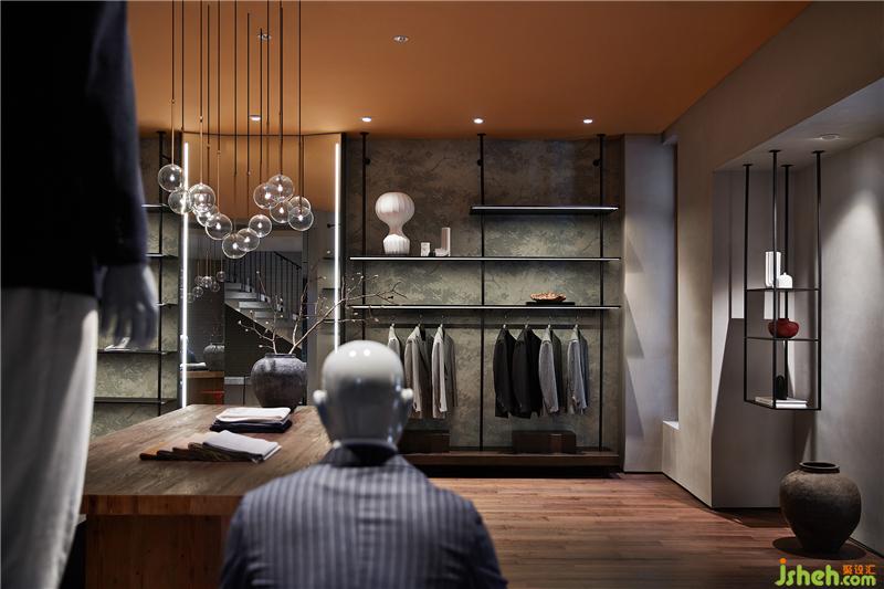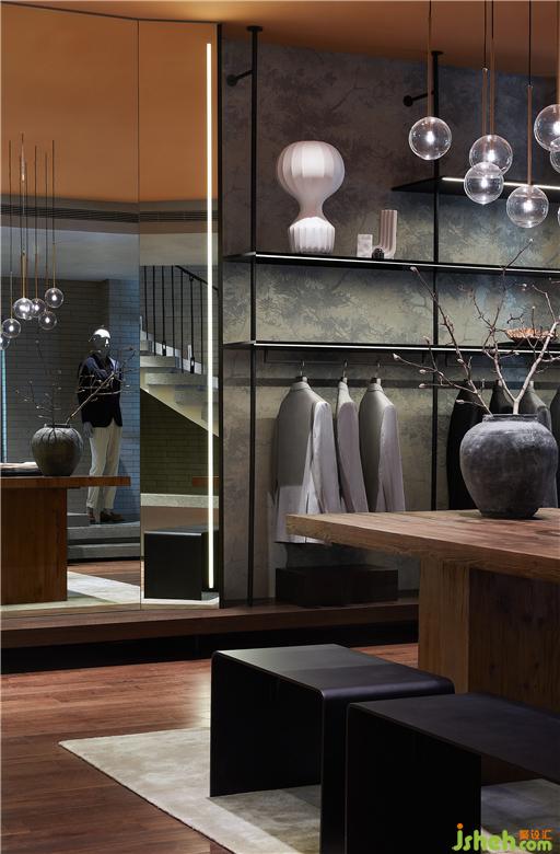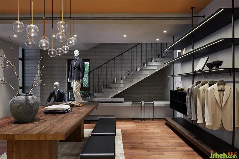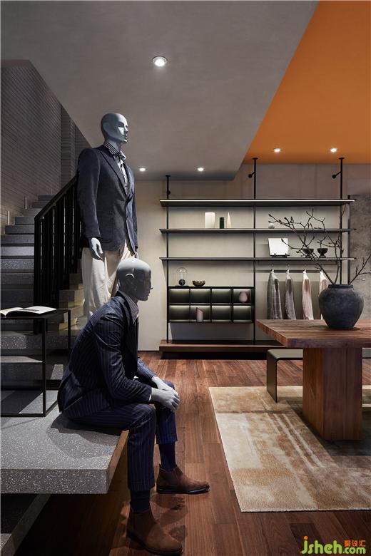 在樓梯處將園林景觀手法借鑒遷入,試圖刻畫(huà)出山巒層疊之狀。服裝店設(shè)計(jì)既滿足上下層連接,又拿捏處理層級(jí)關(guān)系并使之與產(chǎn)品展示相結(jié)合,在這一隅構(gòu)造焦點(diǎn)模特區(qū)域。