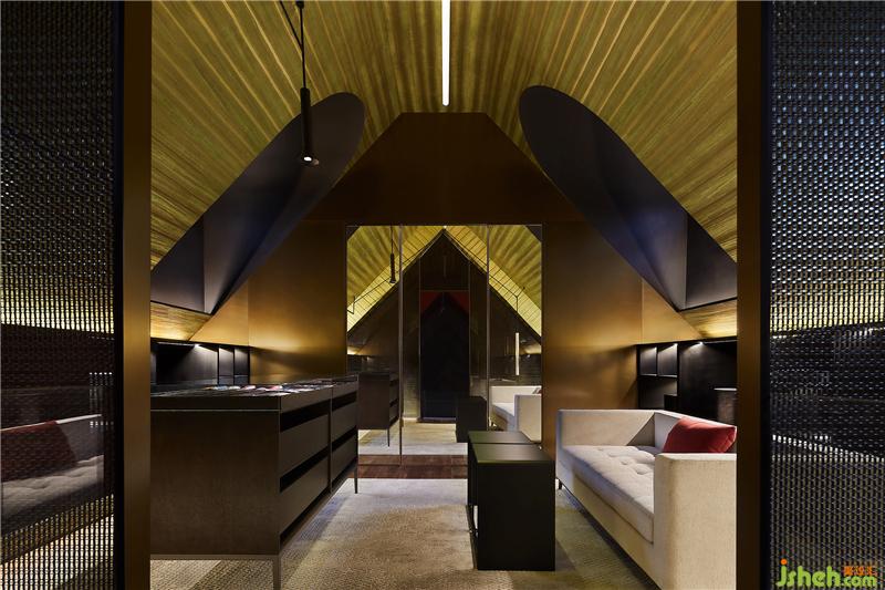 不遠(yuǎn)處的紅色斜頂與金色盒子的搭配,則讓歷史與舞臺(tái)元素彰顯得更加濃烈。VIP室采用懸空式展現(xiàn),仿佛駝峰的外化,又像輝煌的宮殿,這也是絲綢之路主題的進(jìn)一步完善。