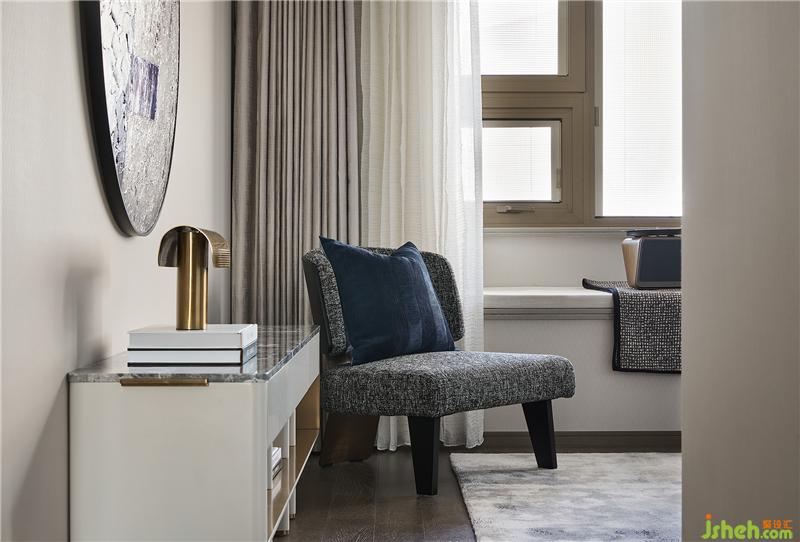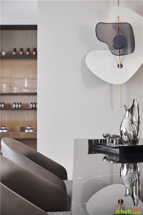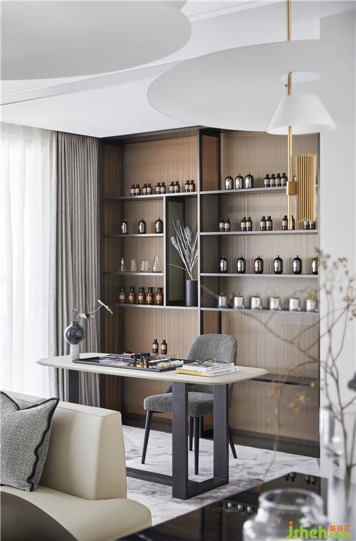 書寫區(qū)則退居后方,以開放式打破單一調(diào)性,格架造型大氣簡約,在規(guī)整的秩序之下,又讓低奢與感性于不經(jīng)意間傳達至每一處。
