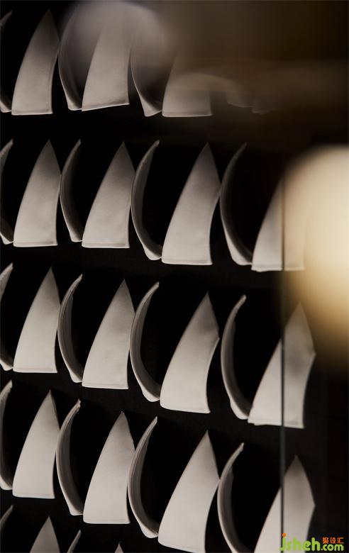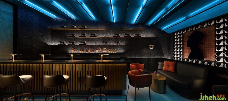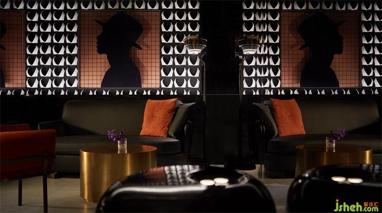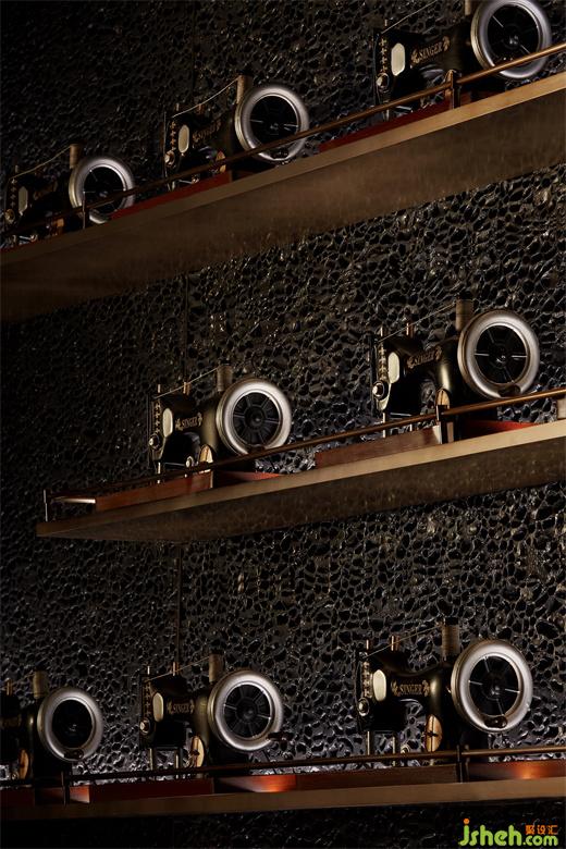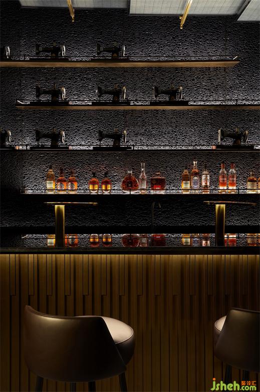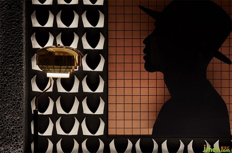 作為藏身于Smelix里面的酒吧,高定男裝的特色元素也得以延續(xù)與強化。大塊黑布鋪陳打底,由量體裁衣的皮尺刻度演變而來的坐標(biāo)格網(wǎng),以紳士剪影疊映其上,白色襯衫衣領(lǐng)圍繞四周,以及另一側(cè)墻面上縫紉機的加持,皆從多維度喚醒主題印記。