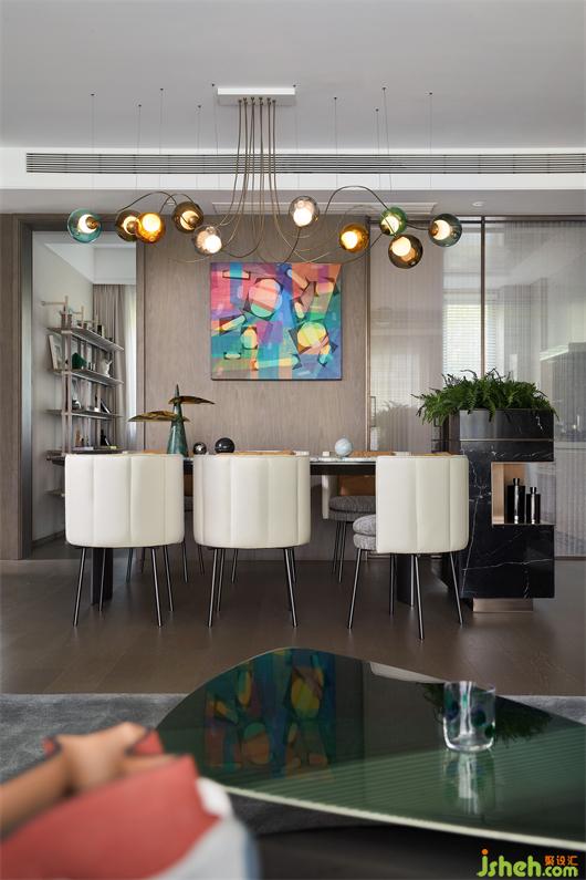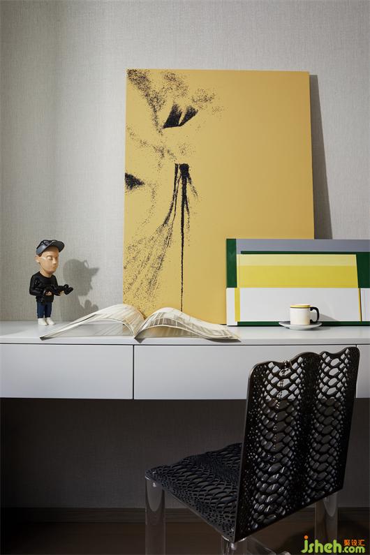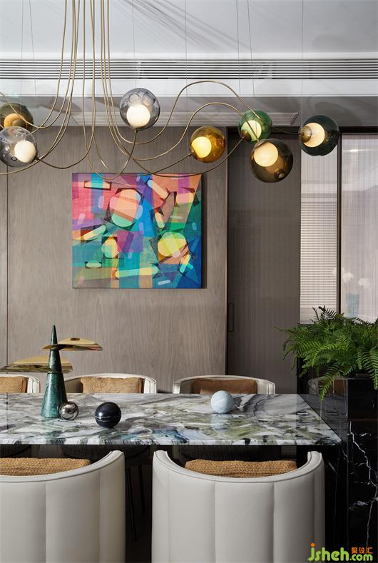 室內(nèi)各種色澤的運用,似乎都可從餐廳背景墻上的畫作《光的呈現(xiàn)》里得以溯源,以抽象的筆觸描繪出具象的有序與變化,也增添一抹矚目且歡暢的光芒。目之所及,錯落有致的關(guān)系、直線弧度的碰撞、剛?cè)峒鏉陌荩餐λ囆g(shù)的高雅與生活的煙火氣和諧交融。