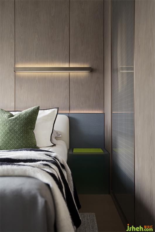 次臥同樣遵循利落簡潔的手法,塊面的疊層之感從床品蔓延至床頭背板,在變化與銜接中形成碰撞,勾勒出多維的層次。看似隨性,實則有內(nèi)在的邏輯關聯(lián)。