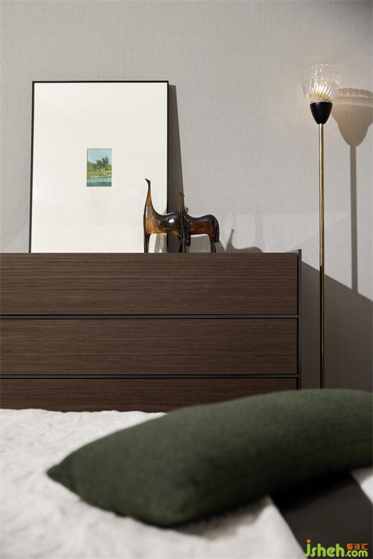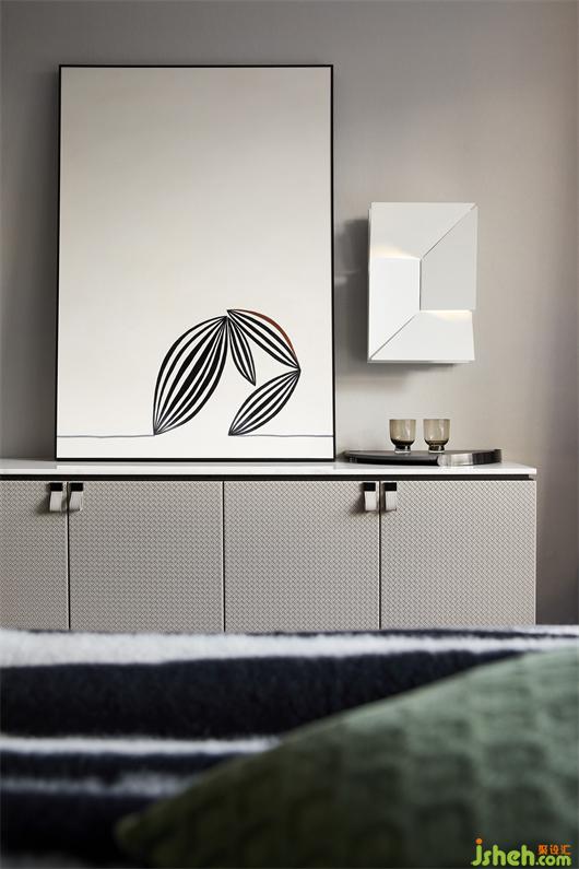 樣板間設計在軟裝陳設上也十分注重秩序美感的傳達。嫻熟運用三角構成營造感官上的舒適,此外兩幅畫作更是有著鮮明的對比與反差,大小有別卻收放自如,充分流露出一種微妙的互動張力。