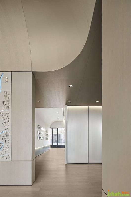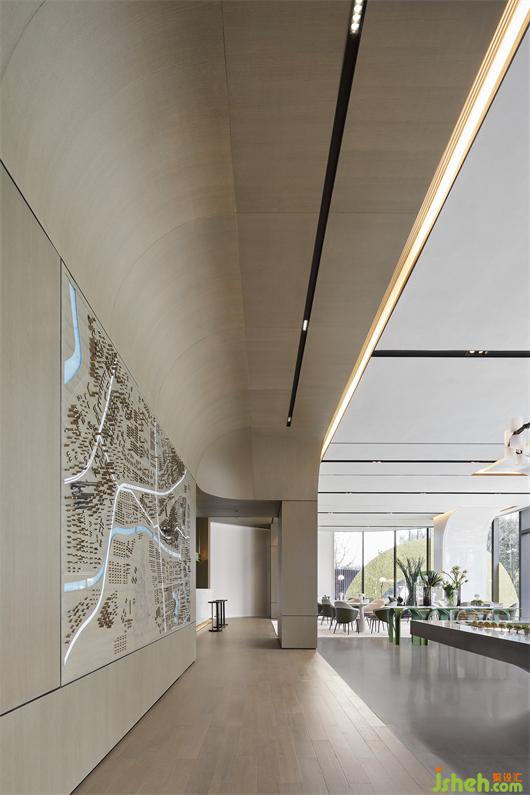 值得一提的是,區(qū)位圖鑲嵌于一側立面,精湛的木雕工藝使其宛如一幅打開的畫卷,南京售樓處設計展示出這片土地的格局與繁華、沉淀與堅守。它既和木質(zhì)背景形成契合的完整表達,同時又自成主體,承載起極為重要的功能屬性。