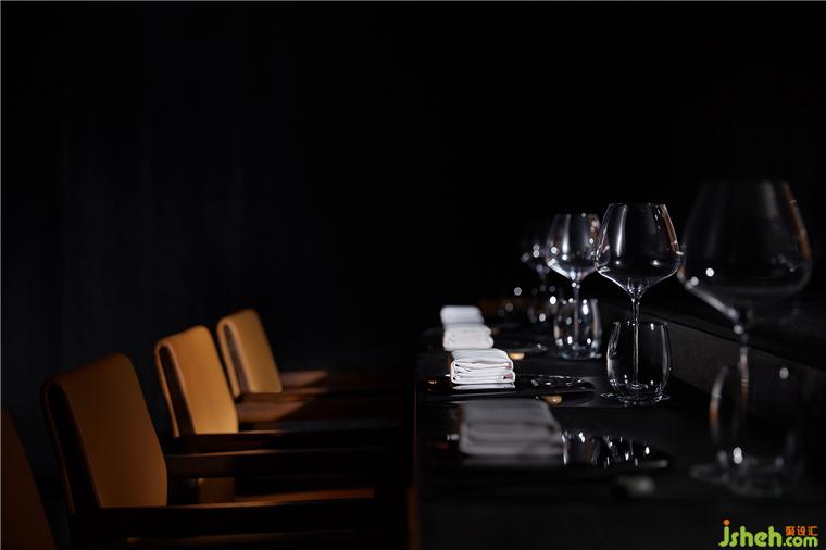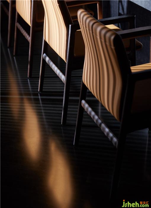 整個(gè)就餐區(qū)色調(diào)統(tǒng)一,間或些許跳色,木質(zhì)、石材、金屬、皮革等相互碰撞,近可感受肌理質(zhì)感,遠(yuǎn)能一覽結(jié)構(gòu)輪廓,鐵板燒餐廳設(shè)計(jì)在光線和視角的轉(zhuǎn)換之下,意味深長(zhǎng)。