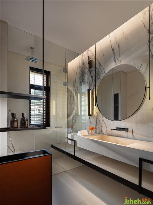 主衛(wèi)頂部設(shè)有天窗,借助光線變化塑造著微妙動(dòng)態(tài),并讓這一隅實(shí)現(xiàn)室內(nèi)外的交融與對(duì)話。此外,鏡面的尺度、位置、造型,乃至圓弧的邊角處理,無(wú)一不凝聚著設(shè)計(jì)師對(duì)功能與美學(xué)的融匯捕捉。