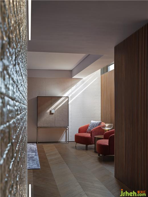 抵達(dá)地下一層,玻璃磚配合燈光的上下烘托,顯得愈發(fā)通透與醒目。遵循中國(guó)古典的步入方式,并體察視覺(jué)落點(diǎn),漸漸揭開(kāi)序幕,引導(dǎo)向前探索。