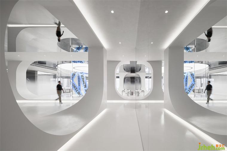 展示區(qū)以地面抬高、頂部疊級(jí)的處理實(shí)現(xiàn)內(nèi)嵌式BOX體塊,并化用蟲洞作為靈感概念,借助有機(jī)形態(tài)的重復(fù)、起伏與映射效果,在交疊透視之下,造就趣味流動(dòng)的態(tài)勢(shì)。