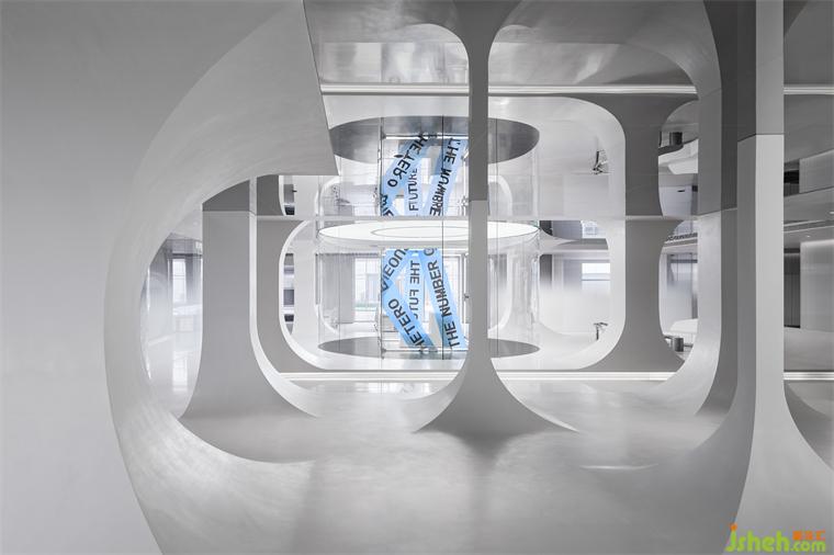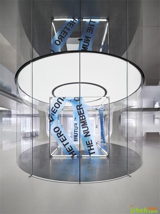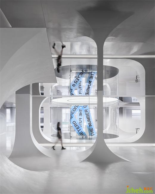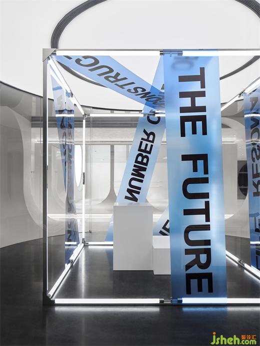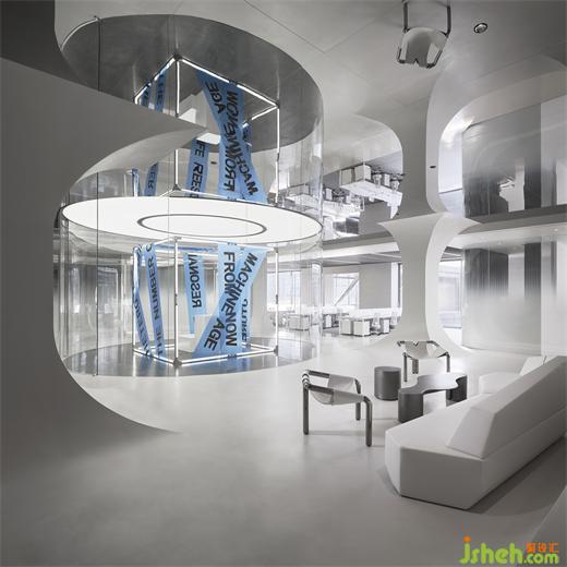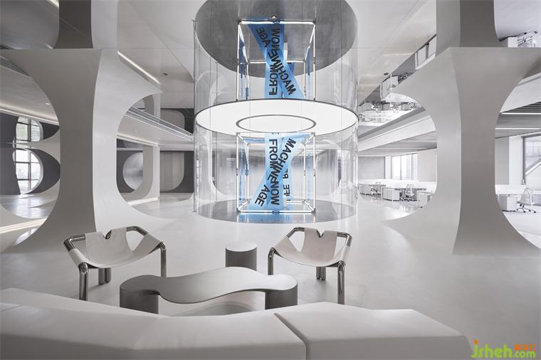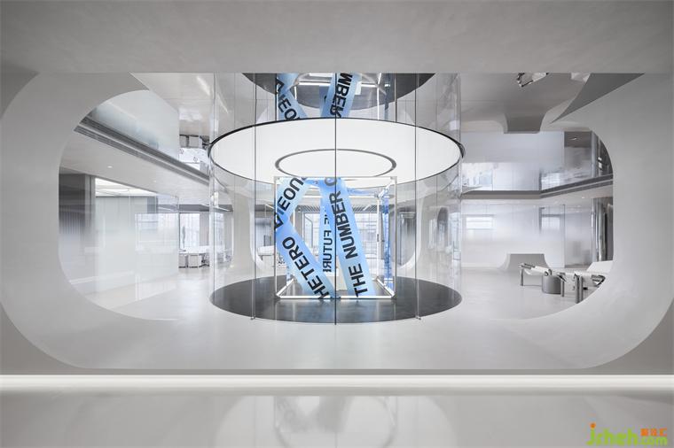 企業(yè)展示區(qū)以留白思維切入,加以跳色與燈光處理,描繪當(dāng)下與未來的功用。它既為展示載體,也是展示主體,輕盈透明的藝術(shù)裝置作為核心樞紐,辦公室設(shè)計(jì)可輕松實(shí)現(xiàn)邊界消融、無限延展的效果。