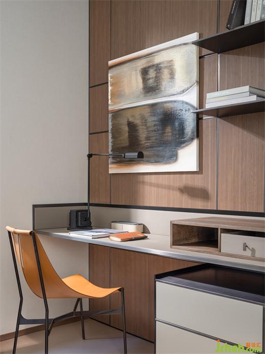 書房內(nèi)不拘一格的陳設(shè),多樣的落座形式,繽紛的場景狀態(tài),映射出思緒的自由無疆。壁掛式書桌、柜體與層板,直觀勾勒通透輕盈之氣。整面木飾格柵打底,規(guī)整干練,又不乏細節(jié)點綴。