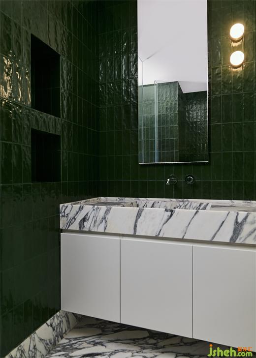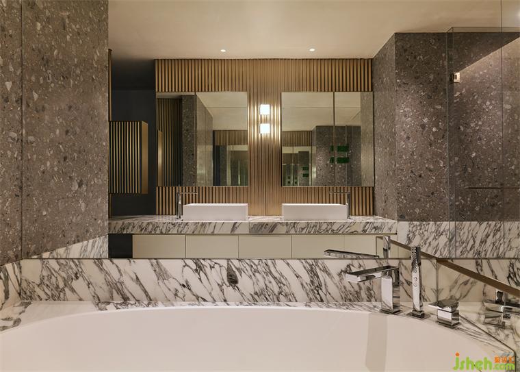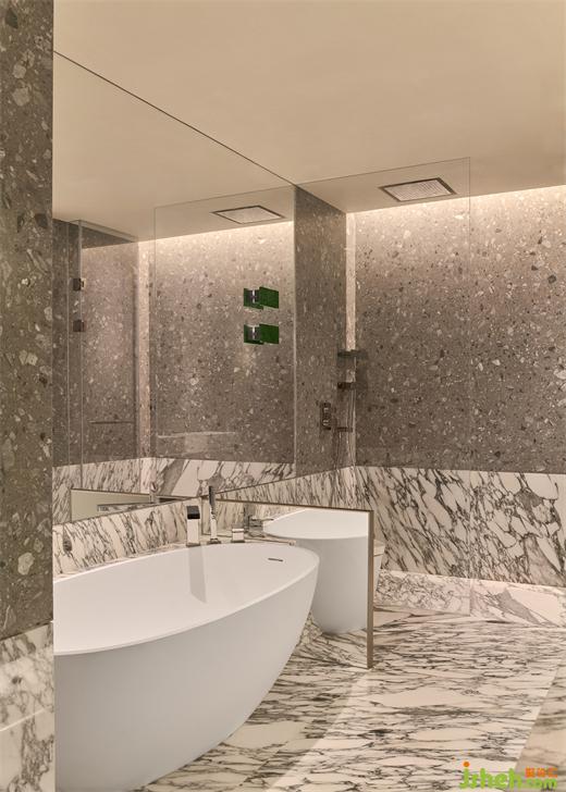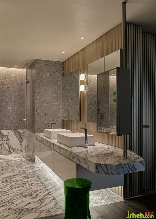在難得的閑暇時光里,業(yè)主會泡在浴缸里休憩、看書。主衛(wèi)配備了多個鏡面,交疊映射,豪宅設(shè)計造就空間的無限延伸,現(xiàn)代性和未來感都得以強化。一個可旋轉(zhuǎn)的美妝柜,為女主人日常生活提供便捷。