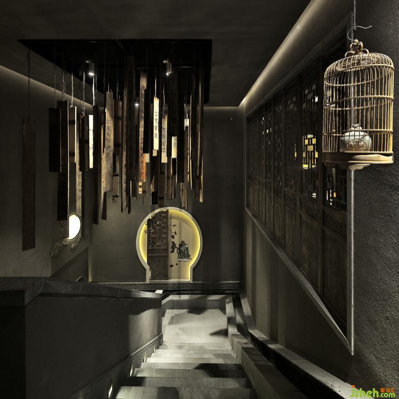 室內(nèi)設(shè)計師將傳統(tǒng)中式元素解構(gòu)、融合現(xiàn)代簡約鐵銹刻字視像,營造空間純?nèi)怀翆?、古雅自然的東方韻味??臻g多處的留白構(gòu)成了東方意境,呼應著傳統(tǒng)東方的雅澹與古樸。端景處,山川綿連,炊煙裊裊,自然從畫中淡出,又從景中入畫,相融于彼此,徜徉在空間中的氣韻,幽然而古樸。