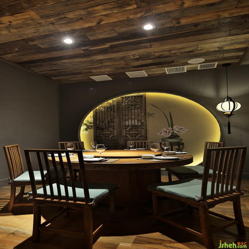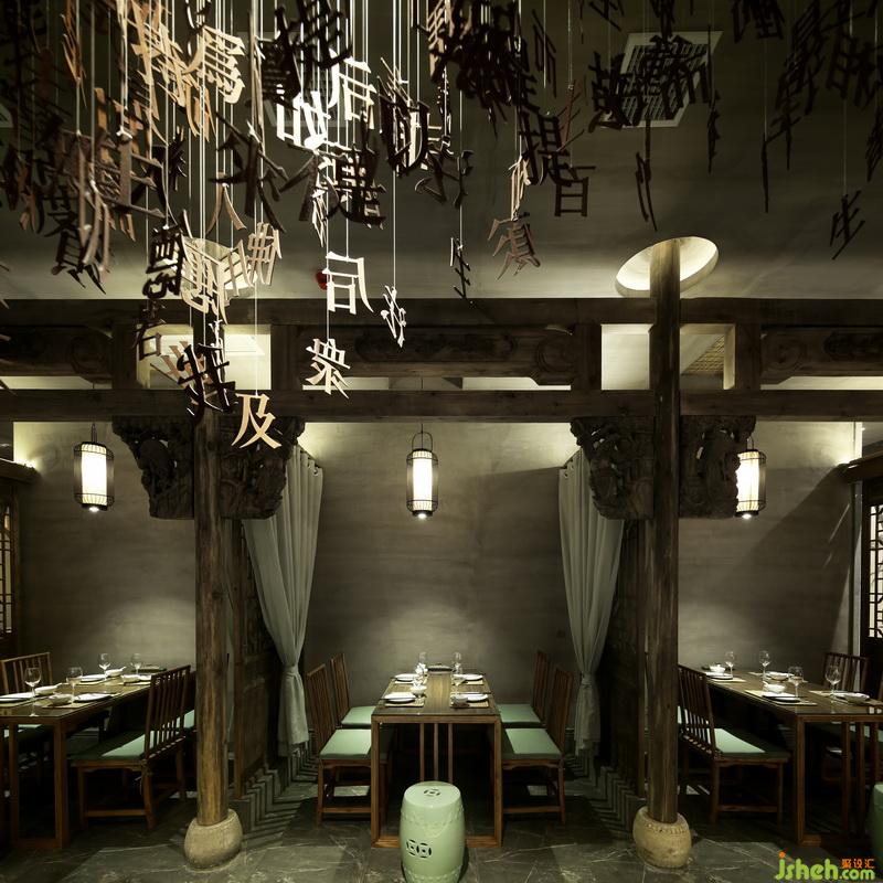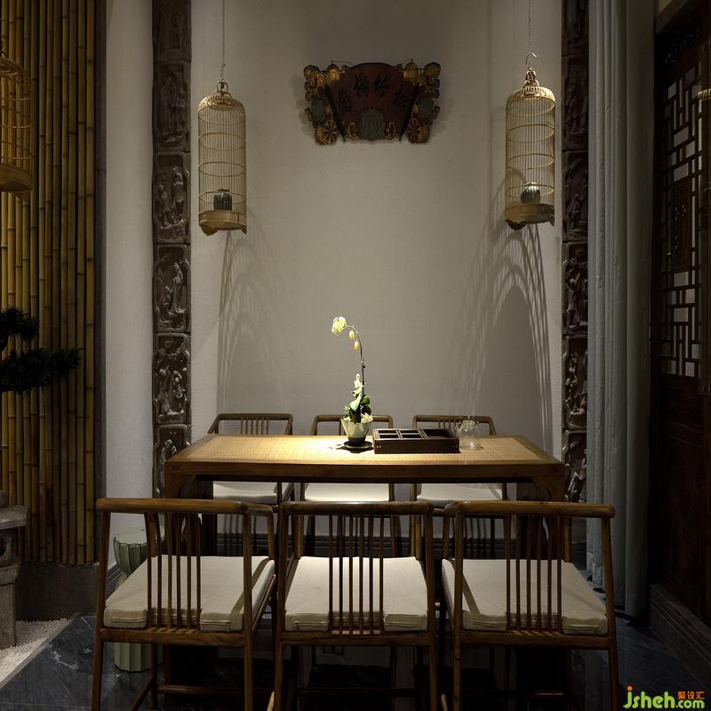 禪家所謂“大死一番,再活現(xiàn)成”。是強調(diào)萬法空性,而不泯滅生命活潑之氣。最大的包廂兩側(cè)安設(shè)了巨幅的半鏡面不銹鋼波浪板和刻滿經(jīng)文的舊木板,室內(nèi)的木構(gòu)與自然輕盈呼吸對流,引入清風竹林幽幽之意,錯落的浮雕佛像在空間遠、中、近景的轉(zhuǎn)換開合自如,行移之間,意境悠遠。