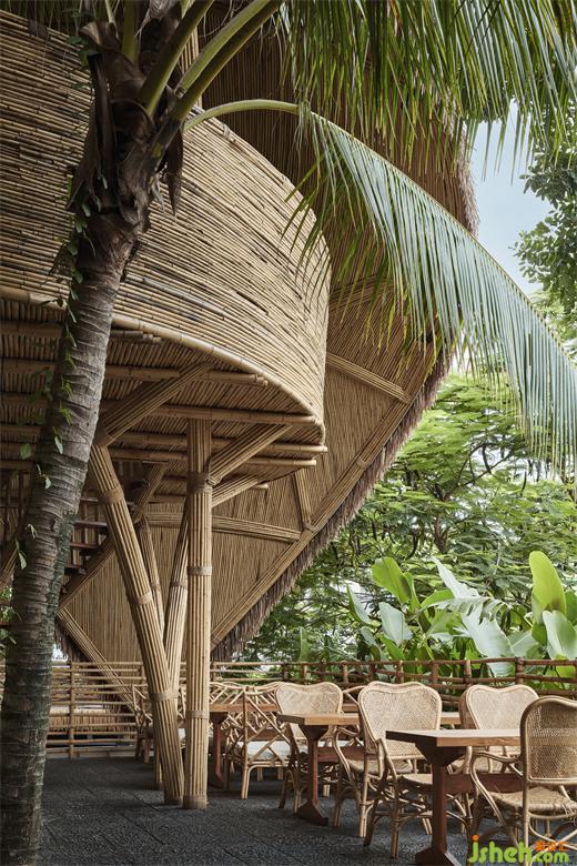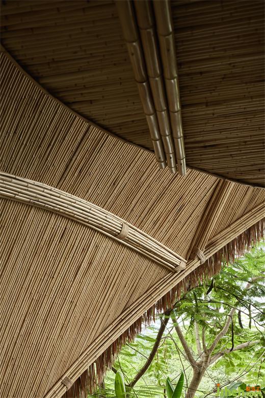 在樓梯外的延伸空間,我們選擇采用版納傳統(tǒng)的竹編古法技藝,會所設(shè)計為這個空間創(chuàng)造了一種與自然深度連接的機會,仿佛將內(nèi)外世界融為一體。這里不僅有獨特的觀景體驗,還有自然的治愈力量。