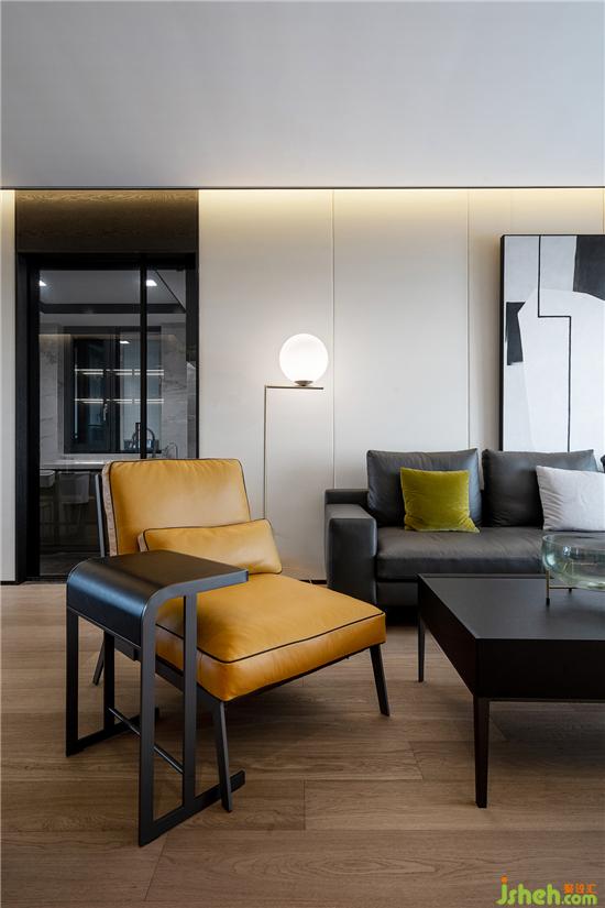 客廳:米白、高級(jí)灰的主色調(diào),奠定了空間沉穩(wěn)內(nèi)斂的底色,沙發(fā)背景簡(jiǎn)練幾何線條與純粹色彩恰到好處的糅合,深灰皮質(zhì)沙發(fā)與黃色靠椅的組合,帶給人以冷靜的精致感的同時(shí)又合理避免了空間單調(diào)之感,黃色系的點(diǎn)綴給空間增添活力。