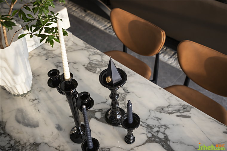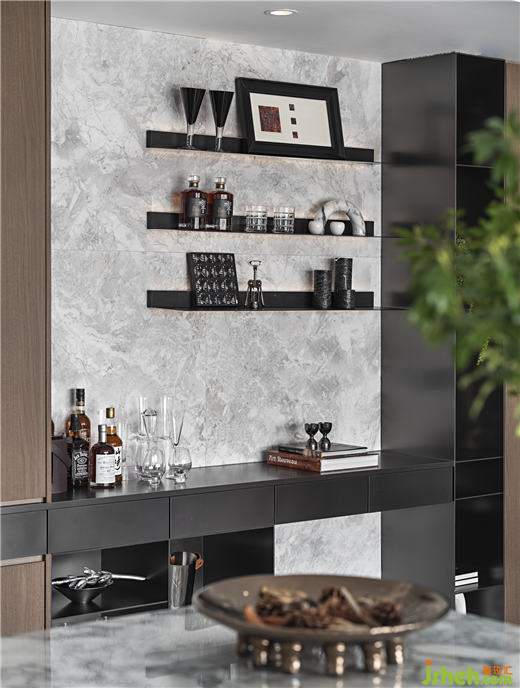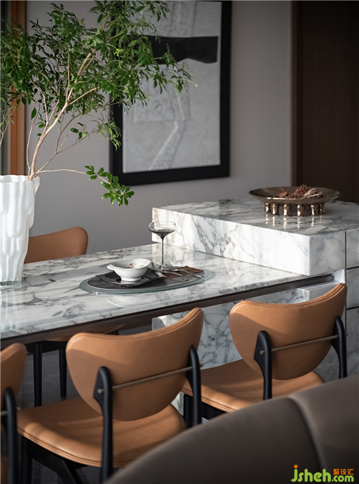 巖板背景墻保留材質(zhì)的原始質(zhì)感,使其更加富有生命力,與沉靜克制的木飾面在空間中碰撞,形成均衡的視覺關(guān)系。