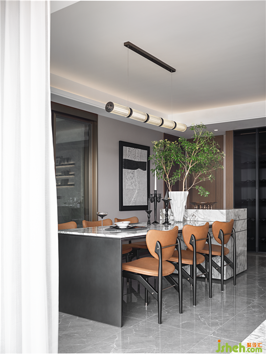 廳前整幕落地玻璃推拉門將湘湖美景無縫過渡引入室內(nèi),內(nèi)與外的延伸被拉長,關(guān)系模糊而溫和,空間與自然得以釋放。