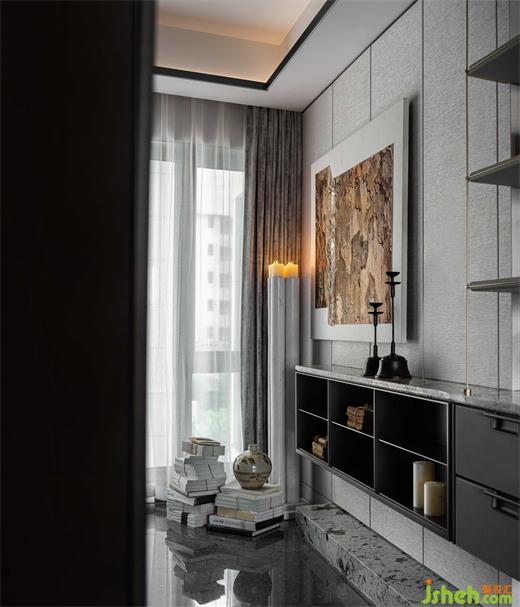 煮茶一盞,書卷一疊,沈靜的語言貫穿空間規(guī)整之中,詩情畫意與日常的生活交疊相合滲透出淡泊悠遠(yuǎn)之意。