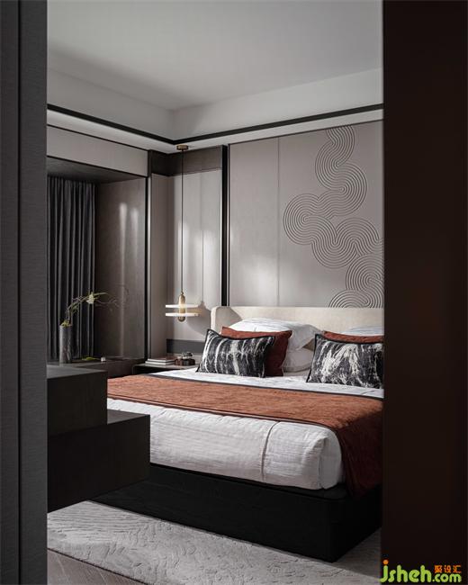 主臥空間優(yōu)雅淡然,皮革、木質(zhì)、金屬、石器在空間內(nèi)互相碰撞,增強(qiáng)室內(nèi)的呼吸感,賦予空間靈動的節(jié)奏。