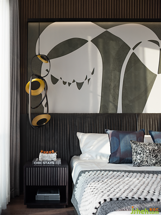 次臥延續(xù)了線性元素,背景墻、床頭柜、黑色褶皺床背及連環(huán)相接的藝術(shù)吊燈,樣板間設(shè)計(jì)以重疊、交織、并置的線條,呈現(xiàn)立體的語(yǔ)言風(fēng)格,勾勒出生活情境的藝術(shù)。