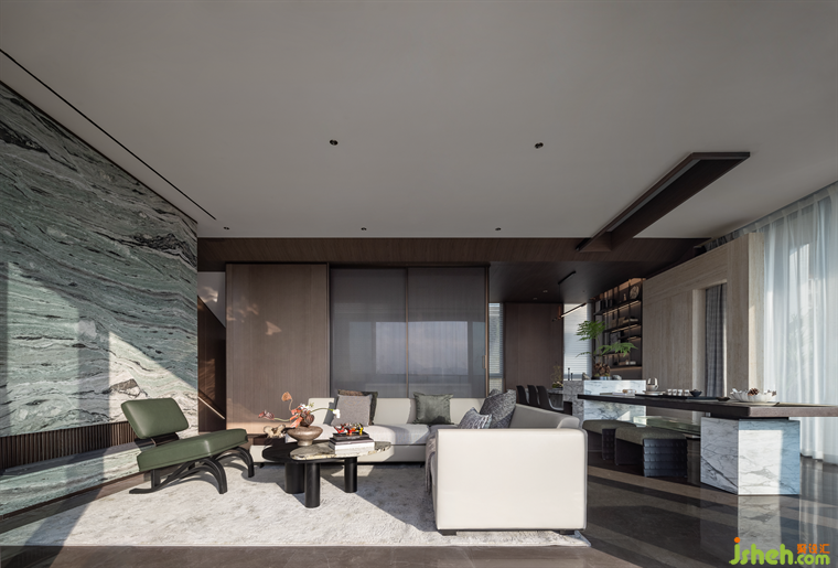 大理石的自然肌理將山的哲學(xué)轉(zhuǎn)譯為空間語(yǔ)言,山川涌動(dòng),曲折多姿,在此刻演繹著空間的