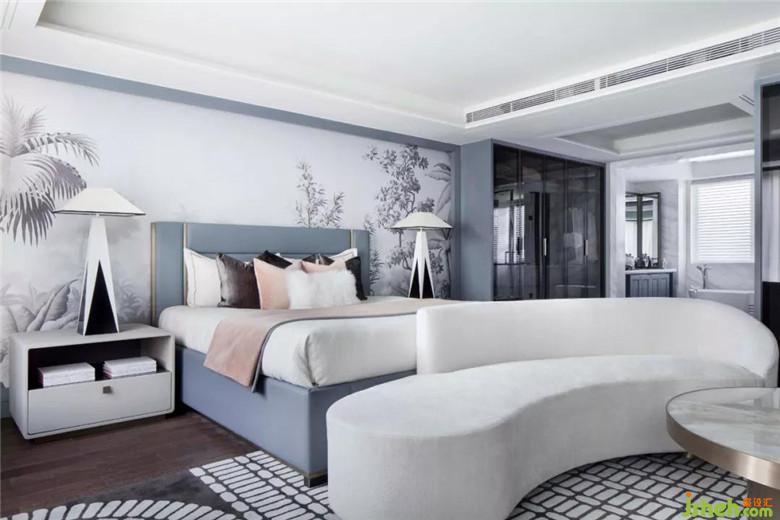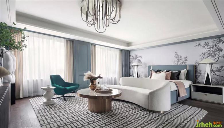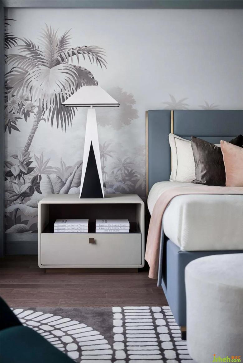 長(zhǎng)輩房空間色調(diào)更加穩(wěn)重,選用大量的灰色調(diào),營(yíng)造空間安靜的氛圍。在寧靜平和的睡眠氛圍中,柔軟的織品更添舒適感。金屬質(zhì)感的鳥與空間主題輝映,幾何燈具打破了深色軟式的沉悶,令空間更為平衡。