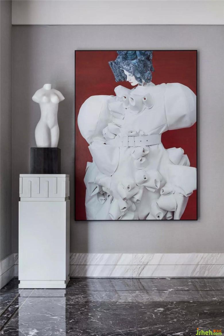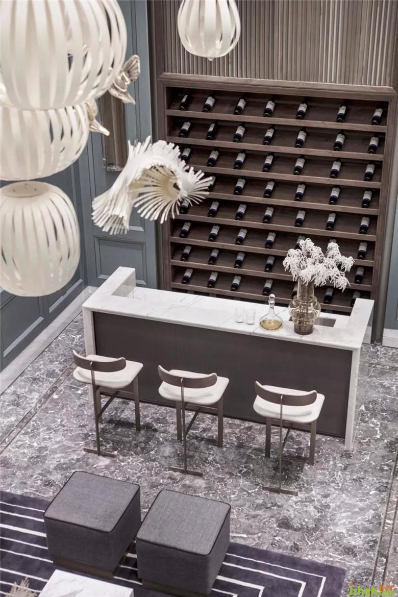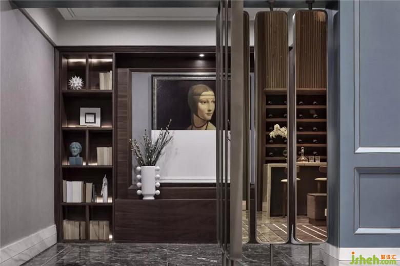 地下二層娛樂休閑室,延續(xù)著主題的致敬·經(jīng)典,深色系的書架上擺放著書籍與雕塑,設(shè)計(jì)師希望不同的空間要素具有其內(nèi)在特質(zhì),每個(gè)空間要素既有對(duì)比又和諧統(tǒng)一。對(duì)比要素之間能夠形成緊密的美學(xué)聯(lián)系,以獲得和諧的整體空間表現(xiàn)效果。使得人居空間文化獲得視覺與心理上的滿足。