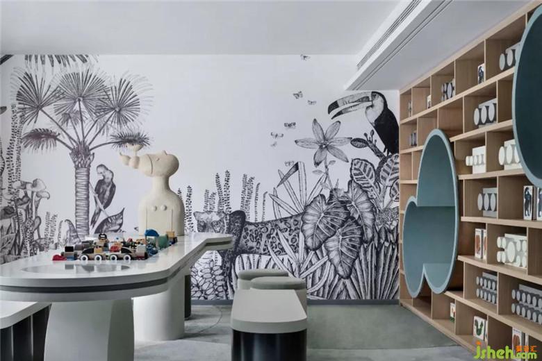 經(jīng)過藝術(shù)感的過道,是充滿童真童趣的益智兒童空間,這里仿若叢林的壁畫,顏色予以視覺無限延伸感。