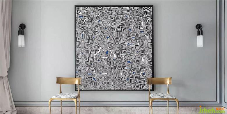 通過(guò)門(mén)廳進(jìn)入室內(nèi),客廳畫(huà)廊成為人的視覺(jué)停留點(diǎn),點(diǎn)簇、曲線構(gòu)成的藝術(shù)畫(huà)作。
