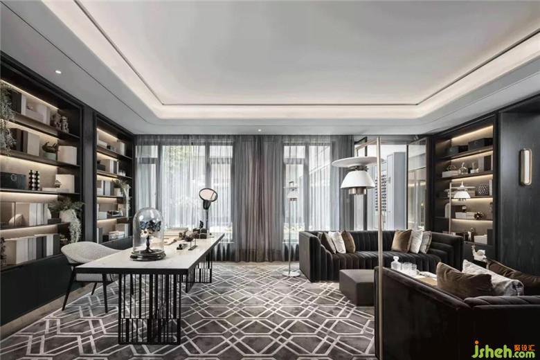 深色的書柜墻面,被柔和的隔板燈光打亮,橫向線條更與空間的書香氣韻共同突顯。