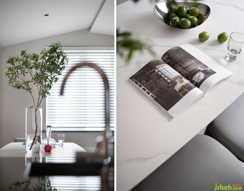 私宅設計半開放式的餐廳布局尤為開闊通透,增加空間的互動性,使廚房烹飪者與客廳玩樂者無界限交流,煙火氣中烹出其樂融融的光景。