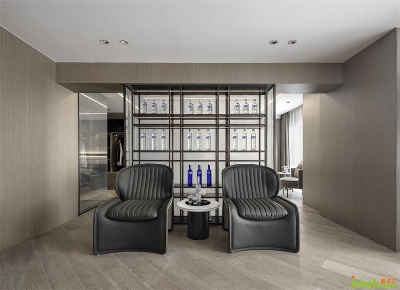 卡座旁設(shè)置棋牌區(qū)和卡座區(qū),與洽談區(qū)交互共融。多功能區(qū)臨窗而設(shè),可供把玩腕表,指針劃過空間,瞄準蒸蒸日上的方向。旋轉(zhuǎn)樓梯對客餐廳區(qū)域自然劃分,餐廳區(qū)域空間典雅整潔,黑色大理石地磚與木色軟裝墻壁、暖咖色的餐桌椅簡而不華,不適優(yōu)雅。黑色不銹鋼和燭臺,在燈光襯托下,質(zhì)感晶瑩,立現(xiàn)生活質(zhì)量感。曲型旋轉(zhuǎn)樓梯蜿蜒而上,呈現(xiàn)大氣沉穩(wěn)姿態(tài)。儲酒間私密而又獨立,杯盞搖曳間,放松工作與生活的的緊湊感,達到舒適愜意的優(yōu)雅從容。