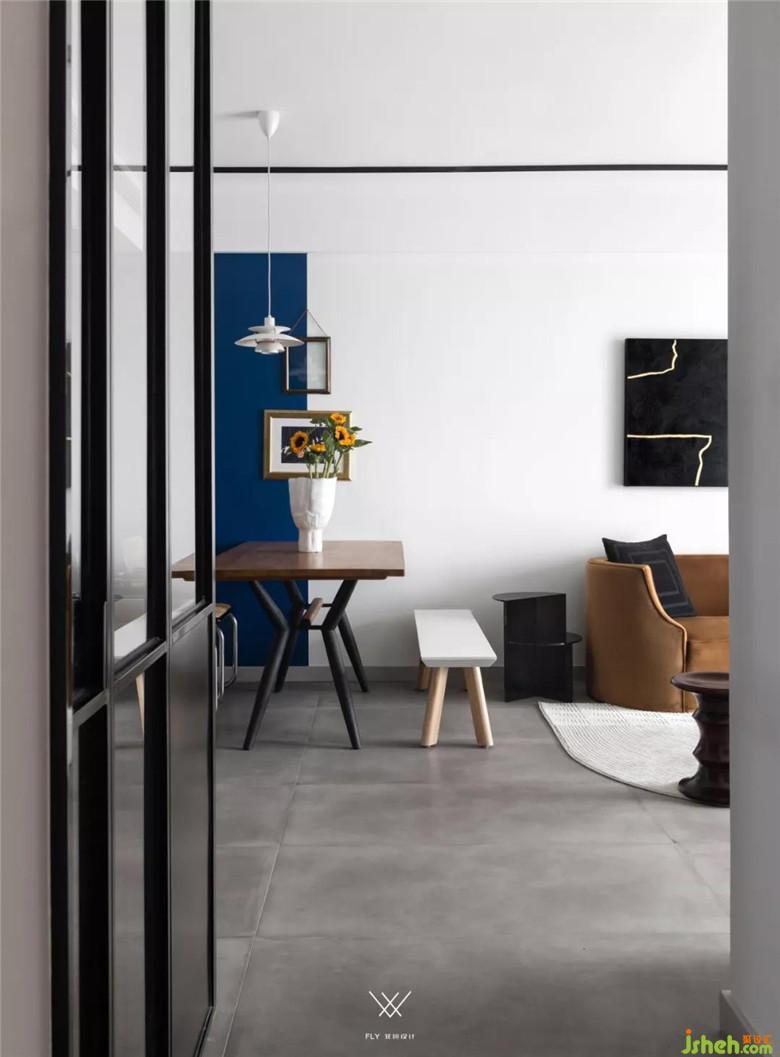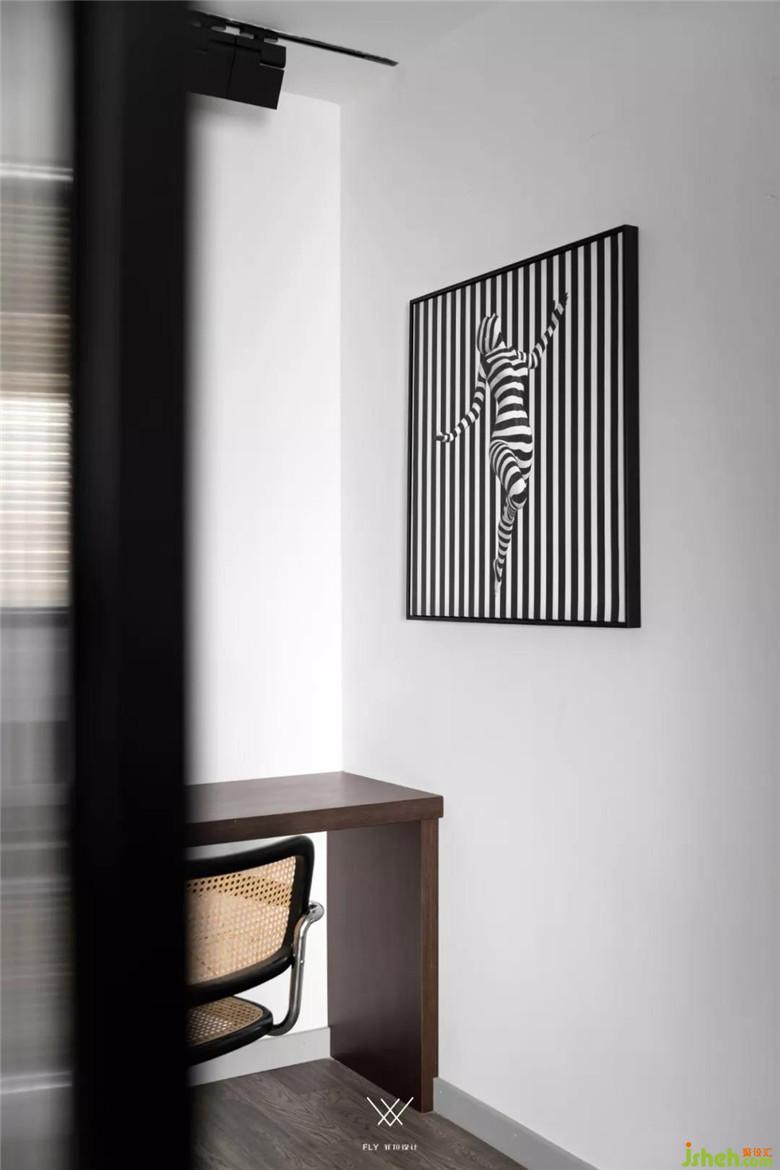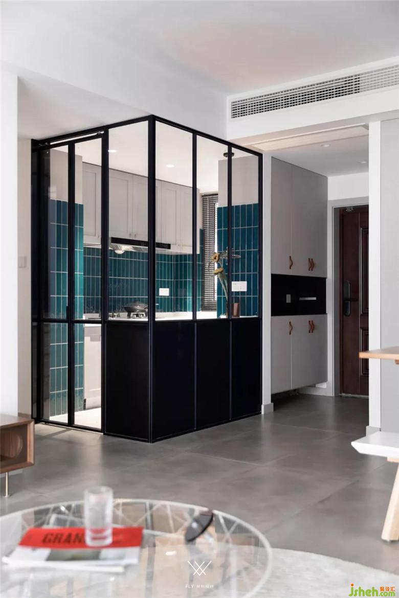 因為不接受開放式廚房,但設(shè)計師又希望廚房可以和周圍空間聯(lián)系,所以改變了廚房的隔墻材料,這樣就不會因為廚房面積小,給空間帶來壓抑。又因為通透的設(shè)計,讓廚房成為了設(shè)計中的一部分,既讓空間聯(lián)系,又不需要為了造型而造型,沒有實用的藝術(shù)呈現(xiàn),在預(yù)算上也省下了一部分。通過廚房的墻體外推,冰箱空間的位置調(diào)整這樣一來廚房就多出了輔助臺面的功能需求,滿足了使用。