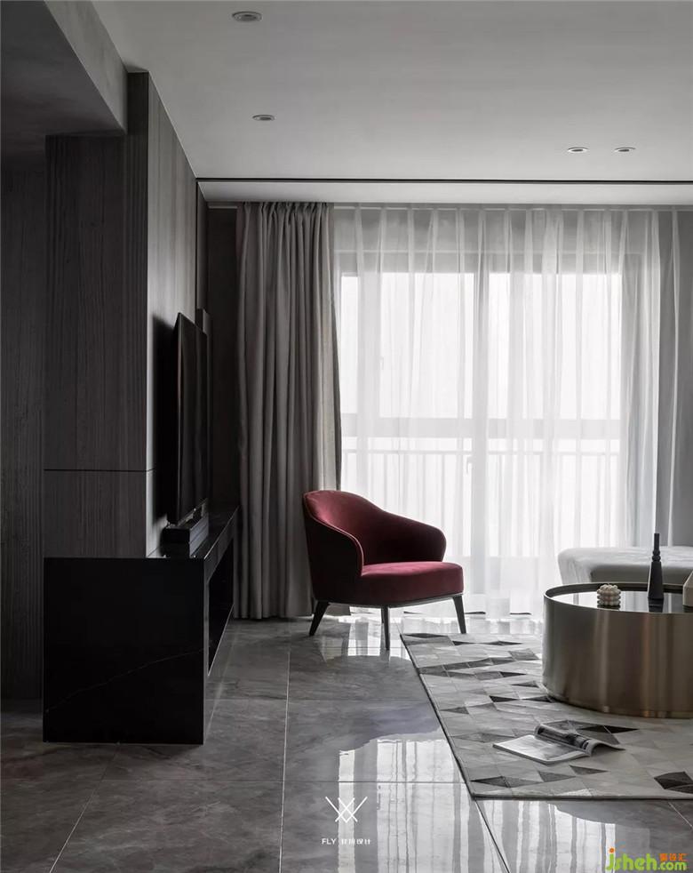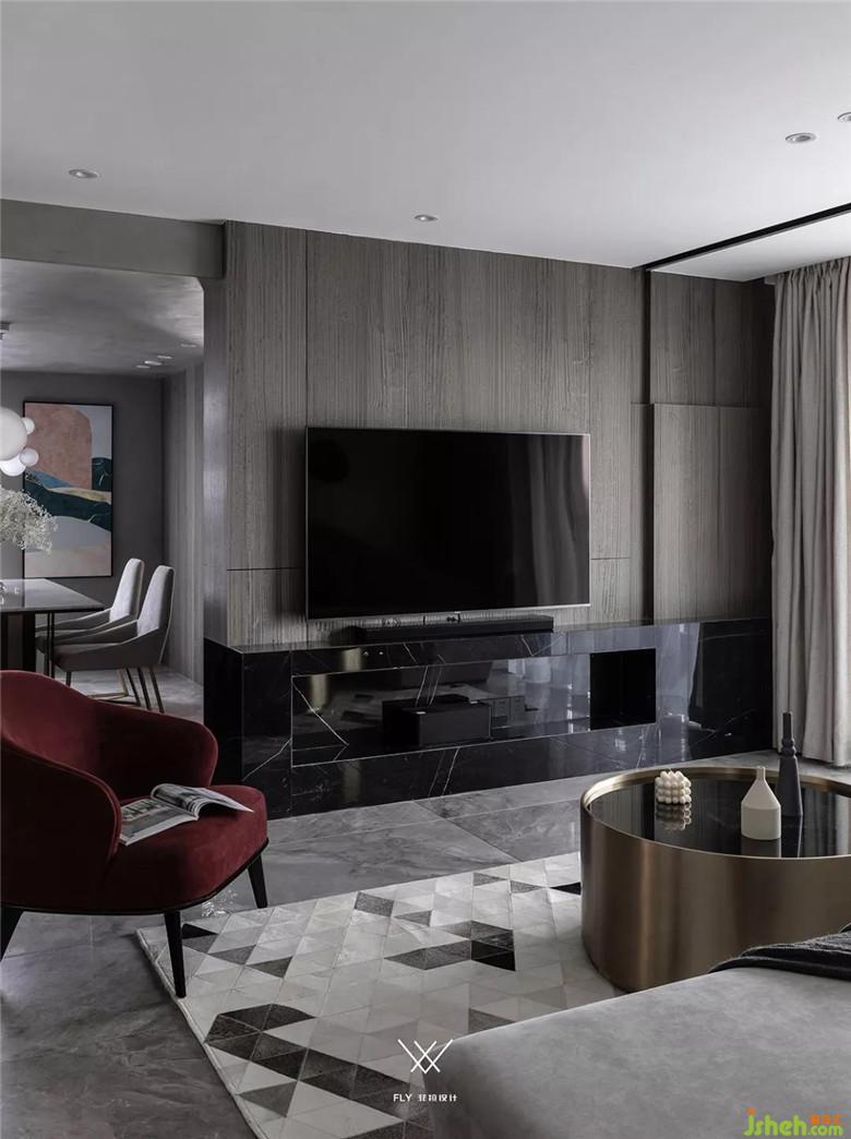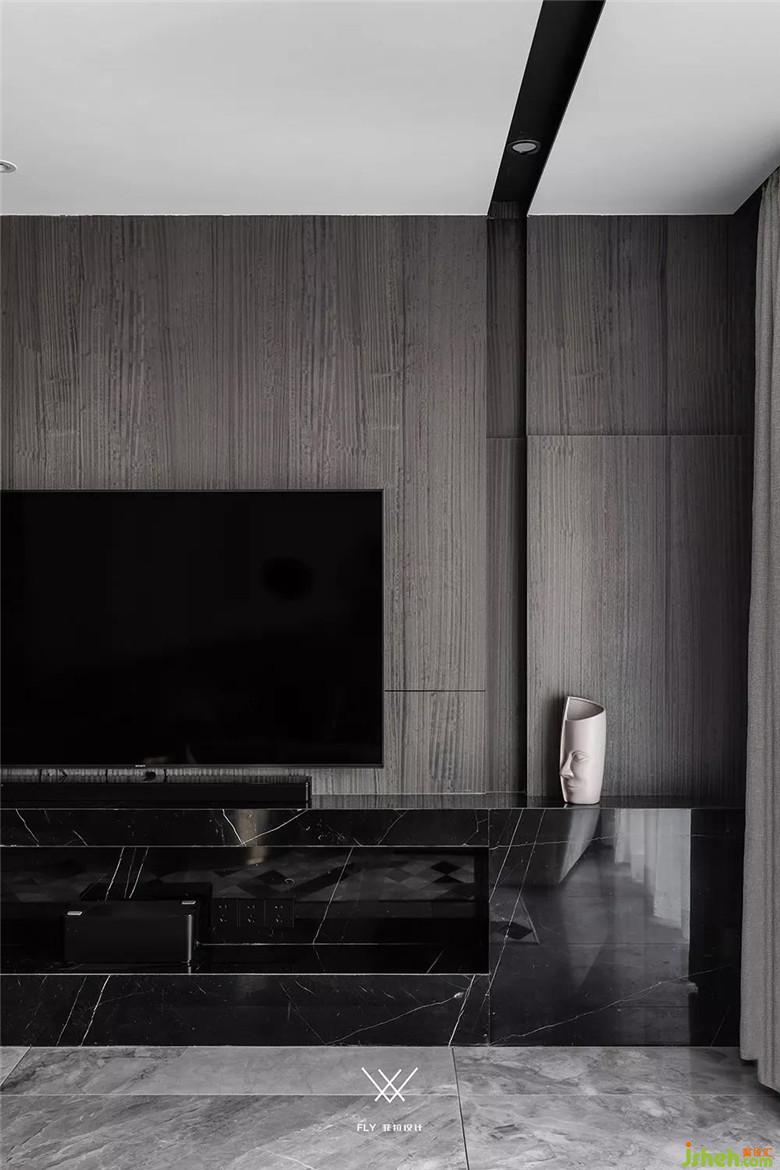 如果看設(shè)計圖的話能夠看到電視機在背景墻的三分之一處。主要原因是沙發(fā)背景墻和電視背景墻長度不一樣,放在這個位置能夠讓電視的中軸線和沙發(fā)中心相同,看電視更舒服。電視背景右邊多余的部分用凹槽加上高低不平的塊面去處理,讓這部分不會顯的突兀。