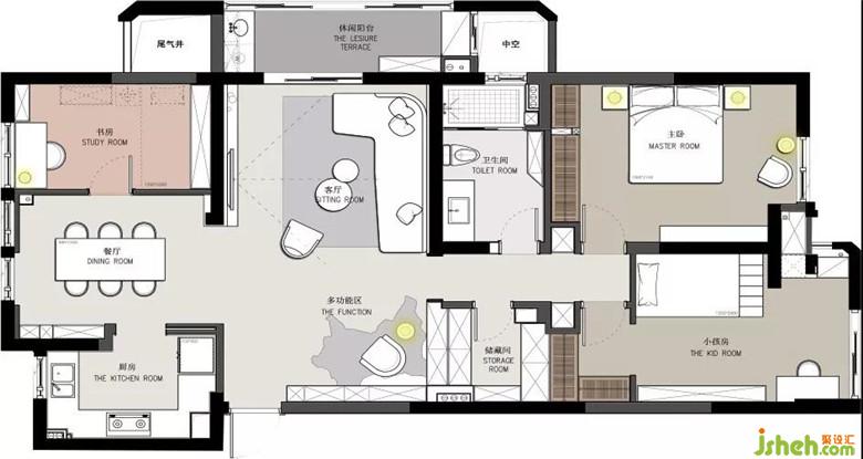 衛(wèi)生間有時(shí)候會隨處擺放東西而導(dǎo)致雜亂無章,為東西太多無處安放而煩惱。本案在衛(wèi)生間設(shè)計(jì)了一個(gè)容量足夠大的柜子,能夠?yàn)檫@些小東西找到很好的容身之所。從柜子結(jié)構(gòu)上來看,還有一個(gè)在進(jìn)入衛(wèi)生間的時(shí)候視線經(jīng)過柜子斜面,有一個(gè)緩沖的作用。