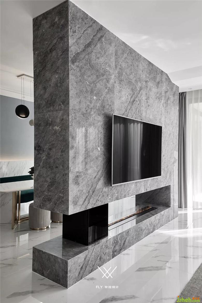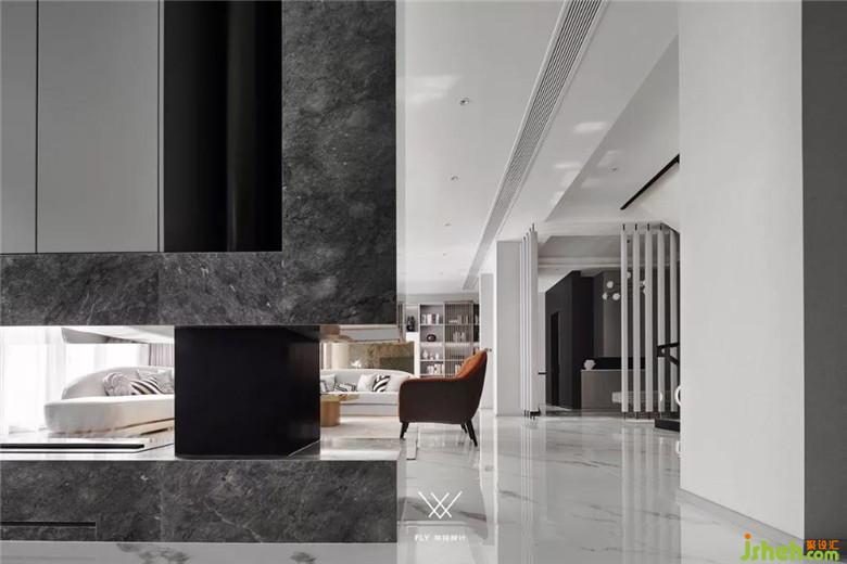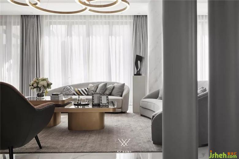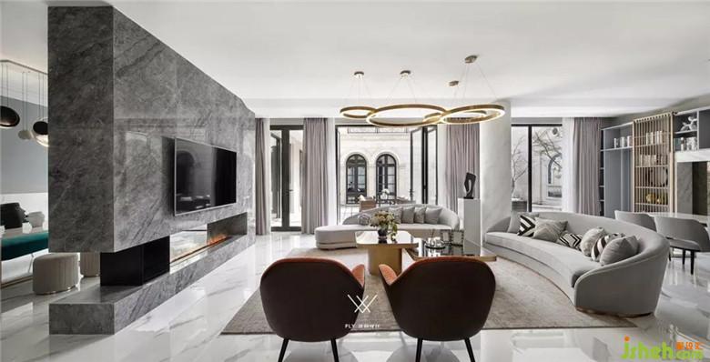 本案定義為現(xiàn)代輕奢風(fēng),現(xiàn)代輕奢是將材料、色彩、燈光及元素進(jìn)行簡(jiǎn)化,以實(shí)用的功能性家具為主,用簡(jiǎn)潔的視覺(jué)效果營(yíng)造出時(shí)尚前衛(wèi)的家居氛圍,用優(yōu)雅低調(diào)最受青睞的高級(jí)灰把持全局,使得整體空間顯得高雅、深邃、寧?kù)o、性感。中性而又低奢的黃銅拉絲材質(zhì)一直伴隨著主旋律而存在,大面積的高級(jí)灰會(huì)稍顯缺乏生活氣息,所以在不同的空間中設(shè)計(jì)師加入了不同的亮色來(lái)點(diǎn)綴,在拉開(kāi)空間層次感的同時(shí)賦予了每個(gè)空間不同的靈魂。
