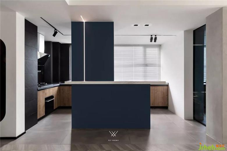 色彩要素在開放式的廚房設(shè)計(jì)上有更多的比重,因?yàn)榭蛻艚o了一定的要求。希望偏男性的色彩,點(diǎn)綴色上就選擇了深藍(lán),它的沉穩(wěn),既能表達(dá)出男業(yè)主的性格,同時(shí)也能讓空間安靜。藍(lán)色作為吧臺結(jié)構(gòu)穿插的主角,配合上開放式廚房的黑色瓷磚和木色門板,通過色彩讓空間在視覺上產(chǎn)生區(qū)域的劃分。