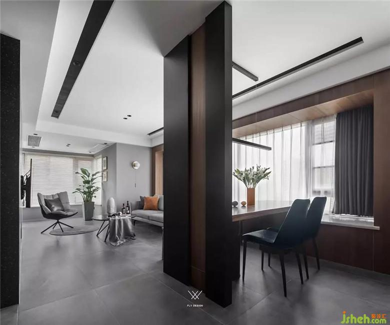 為了擴大廚房的可用臺面加大空間的利用率,從玄關(guān)處進入廚房,同時將書桌與儲藏柜和電視背景墻穿插,使空間的休閑書房,客廳,餐廳連成一體,在視覺上加大空間的通透性。