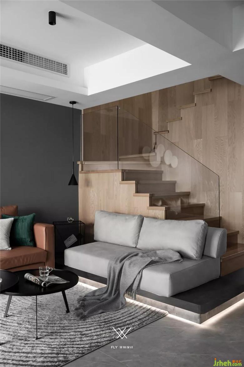 在這套居家空間里,裝修公司的設(shè)計(jì)師在滿足客餐廳公共活動空間足夠開敞和互動性,保證效果的前提下,在很多不起眼的地方做了足夠多的收納空間。比如樓梯下的空間一部分劃分給客廳做雜物間,更多的分給廚房放冰箱,蒸烤箱。