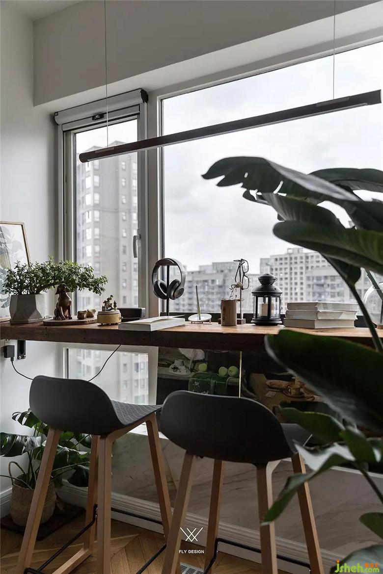 裝修公司在餐廳窗邊做了休閑吧臺(tái)兼書桌,桌板是用老原木自己Diy的,坐在這兒,耳邊響起輕快的音樂,看著喜歡的書,這將是多么美妙。從這里跨過餐廳,走入客廳,到達(dá)陽臺(tái),地面?zhèn)鱽淼氖墙z絲暖意,也許這就是幸福的感覺。