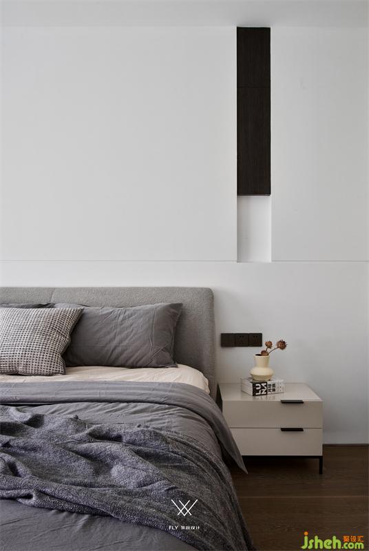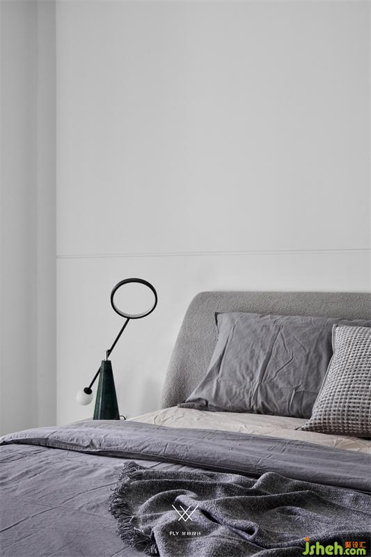 The space layout is orderly with the separation of movement and movement. The sleeping space is on the second floor. Layering style, mud grey collocation black and white to make quiet, relaxed bedroom atmosphere.